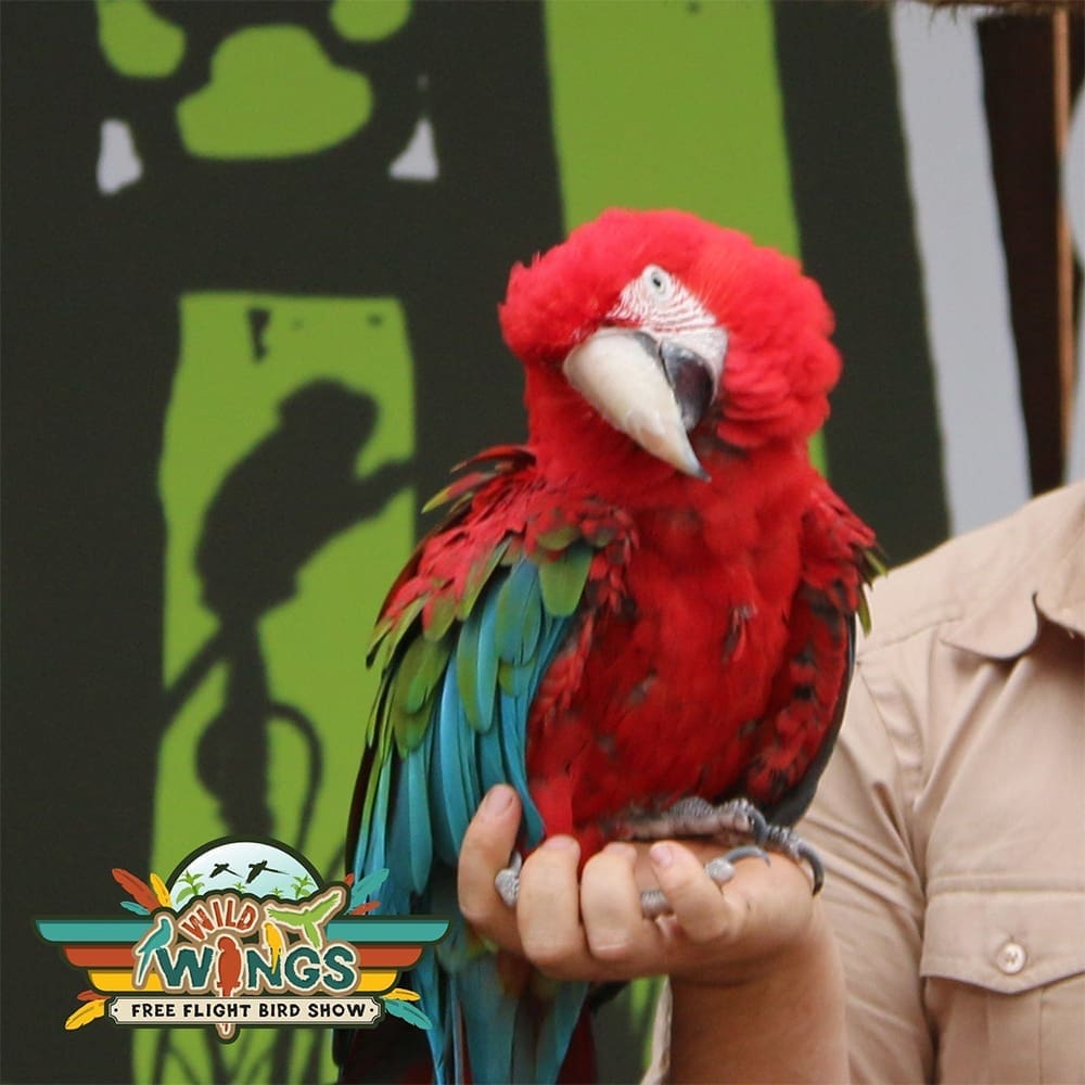 Hi I’m Cybil the Greenwing macaw. You can find me in the walk-through Amazon rainforest section of the zoo and also flying free during the WILD wings bird show. I am super smart with the intelligence of a 5 year old person and I could live to be 80 or 90 years old!